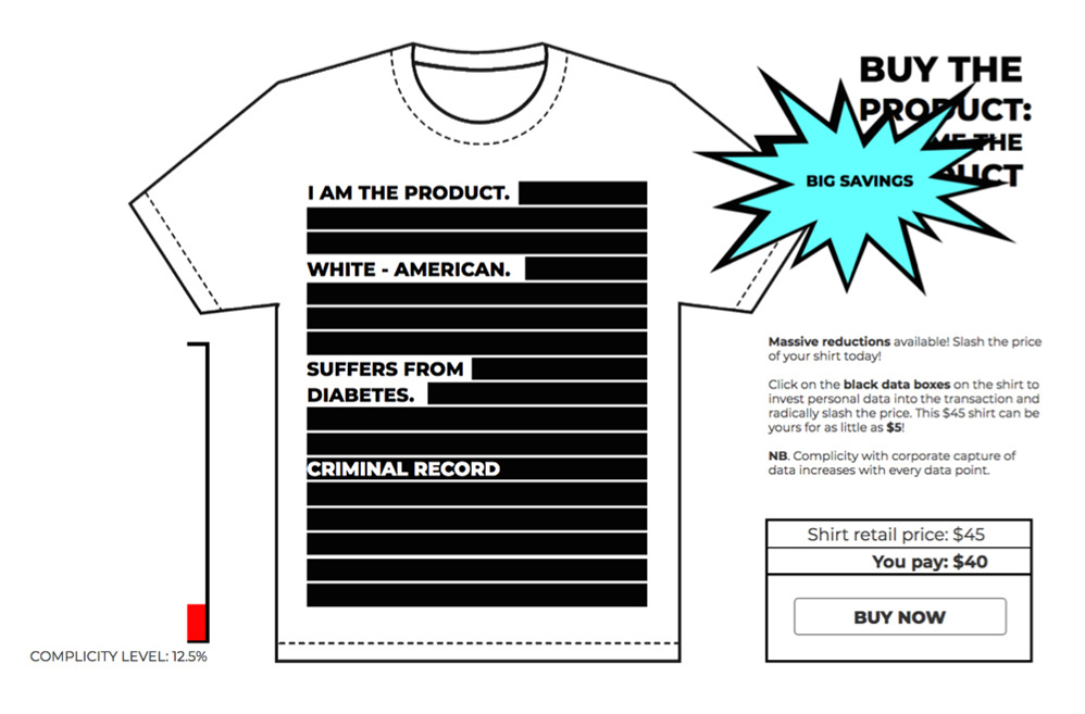 An exploration of the explicit trade-off between personal data and monetary value. 'I Am the Product' consists of iterative versions of a website that enables consumers to personalise t-shirts with their own data: the more personal and revealing the data supplied, the cheaper the product becomes.