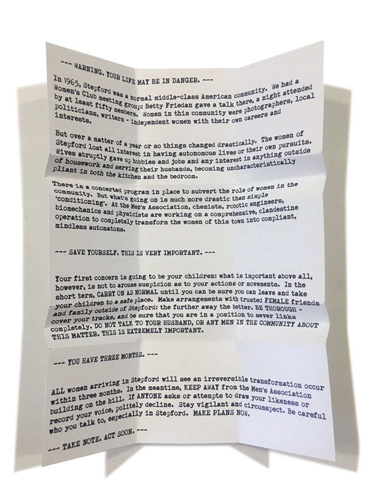 Inspired in part by Moma's Design and Violence exhibition, the aim of this project was to provide an escape kit for a potential victim of the 'programming' in Ira Levin's 1972 novel 'The Stepford Wives'.