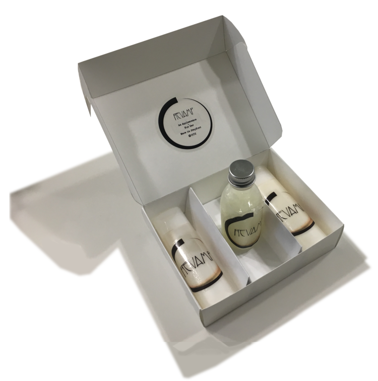 The kit consists of three items of a toiletry kit: a box for shampoo, one for soaps, and a bubble-bath bottle. Branded under the name 'Revamp' (subtitled 'an Acquiescence For Her'), each piece of the toiletry kit provides hidden assistance within its packaging. Folded inserts inside the two boxes open up to provide warning information and a map respectively.