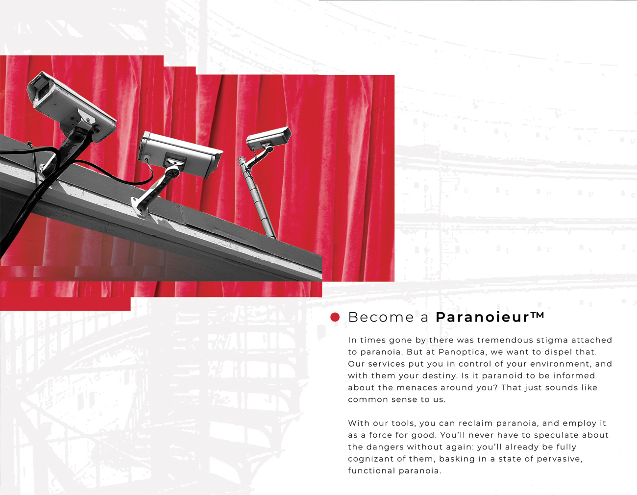 A5 publication designed and printed for the Panoptica installation, detailing the satirical company's suite of products and services.
